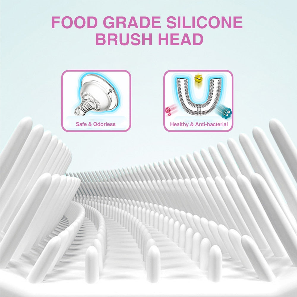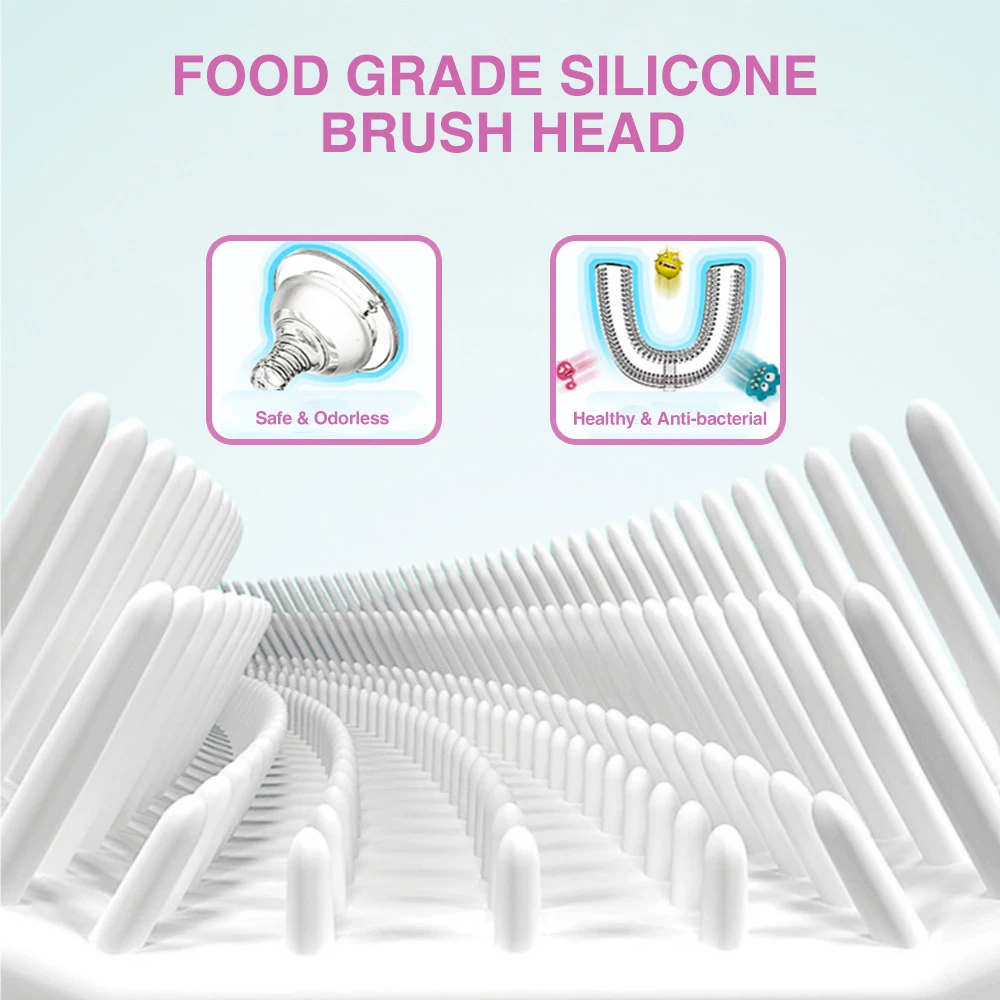 Efficiency: The 360° auto clean features three modes: regular brushing with sound, powerful brushing with sound & powerful brushing without sound. Kid Safe: The brush is FDA-approved, made out of extra-soft premium silicone for maximal comfort during brushing whilst ensuring no abrasion to the teeth.