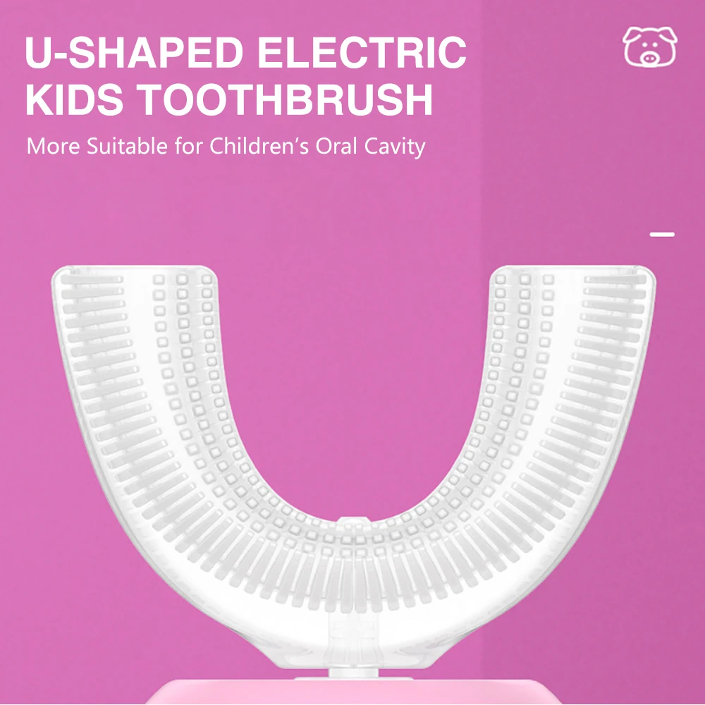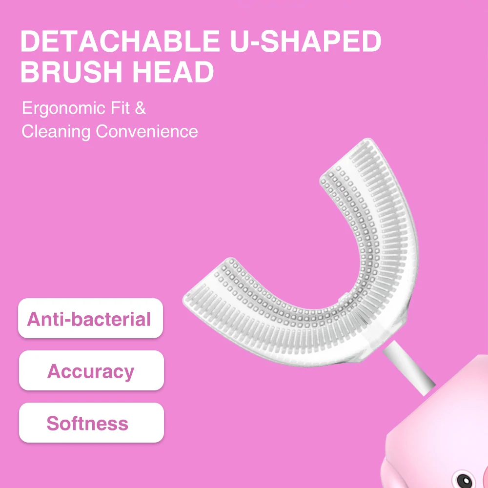 1.U-shaped design can completely contact the gums and teeth with ergonomic perfect fit, fast to complete a 360 degree full brush movement with high efficiency.