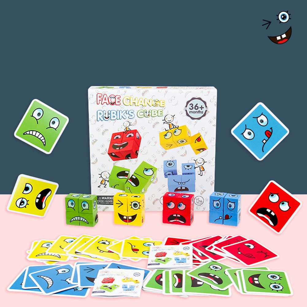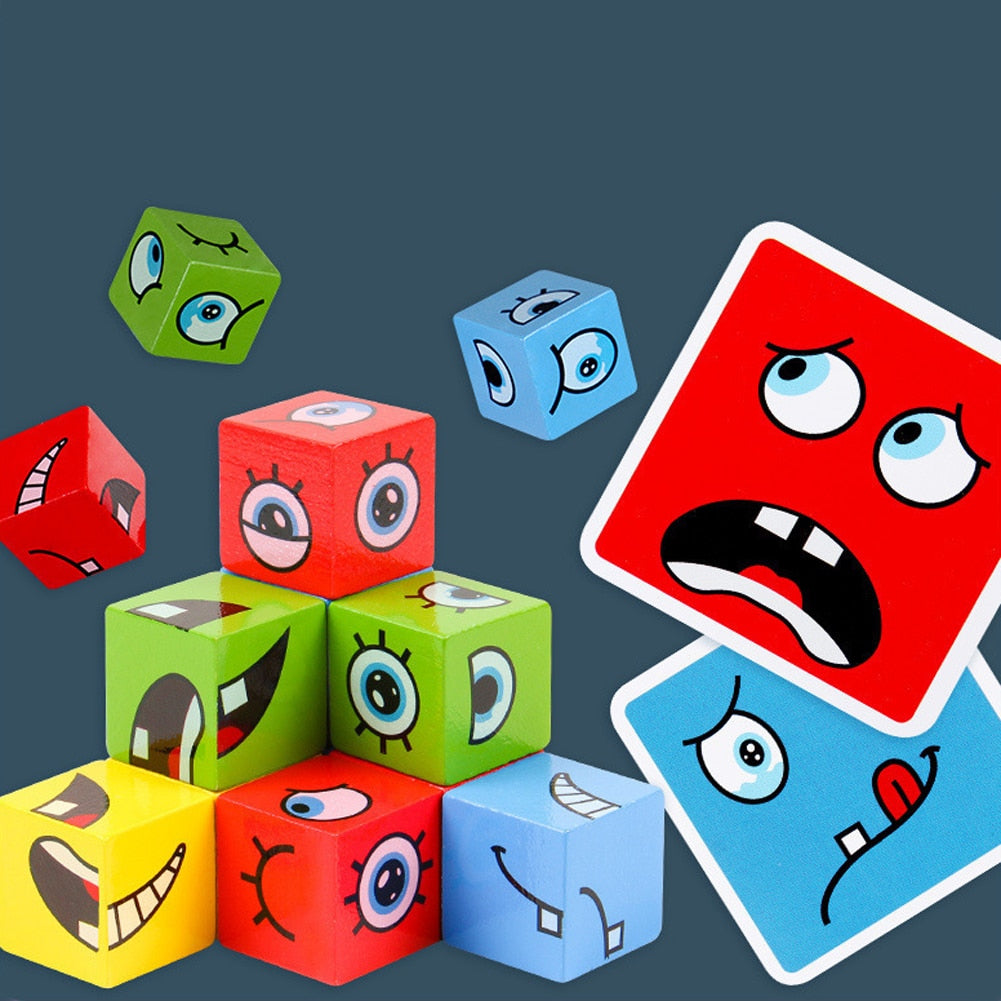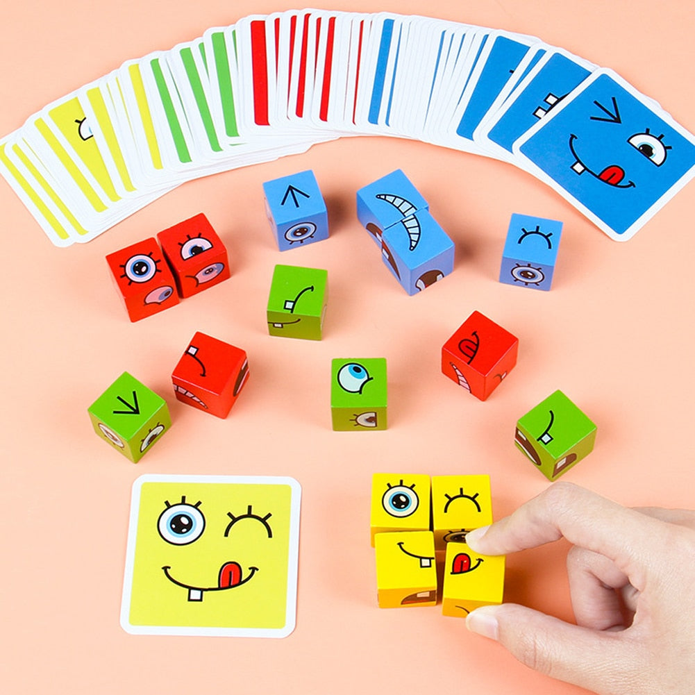 This game has four color blocks. Shuffle the cards, pick one at random, and let children build the blocks. There are different cartoon expressions on each side of the block, and there are cute expressions on the instruction card.