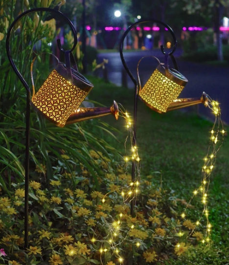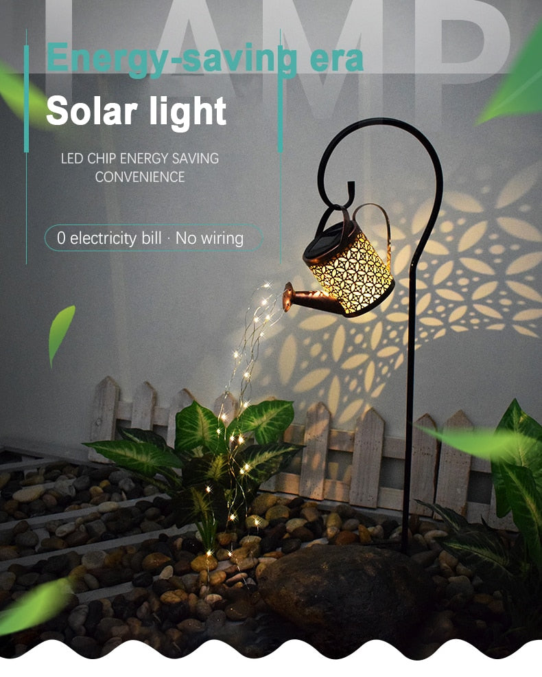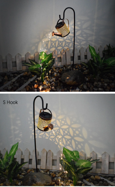 Style: 1. shower + lamp/ 2. bracket + shower + lamp Size: pot diameter 11cm, height 13.5cm, whole 80cm Material: Iron Solar panel: Polycrystalline: 2V 120mah Battery: 1.2V AA 600mah LEDs Number: 36 silver wire lights Light color: warm light .
