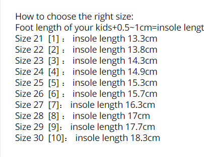 Note: Please see Shoe Chart There is a difference of 5mm between the length and the inner length of the shoes. Please read the size chart before you purchase or choose a bigger size.