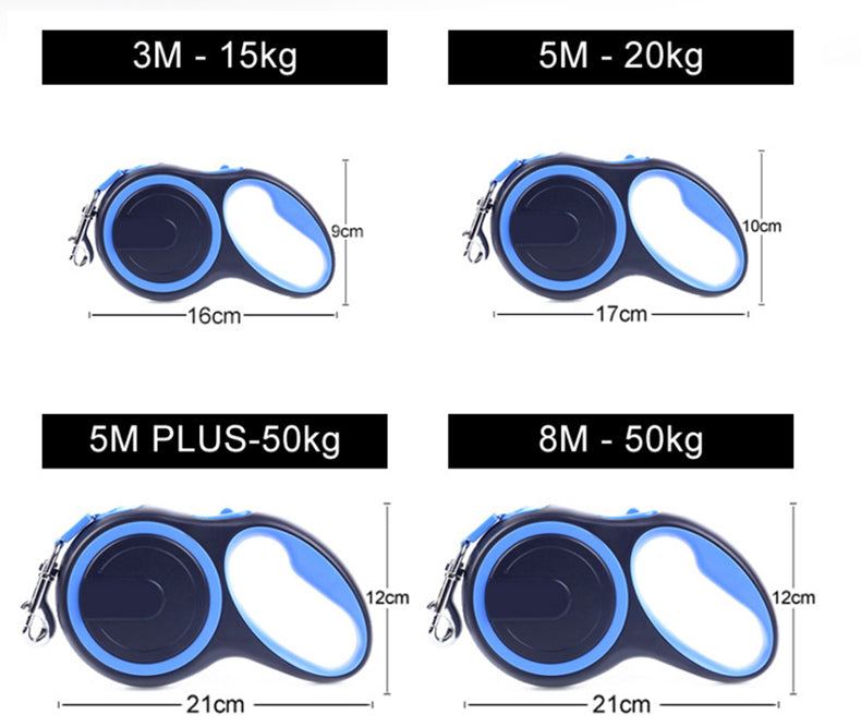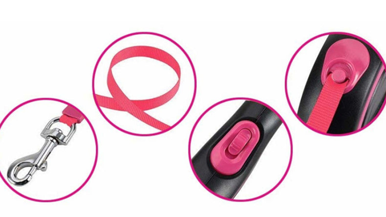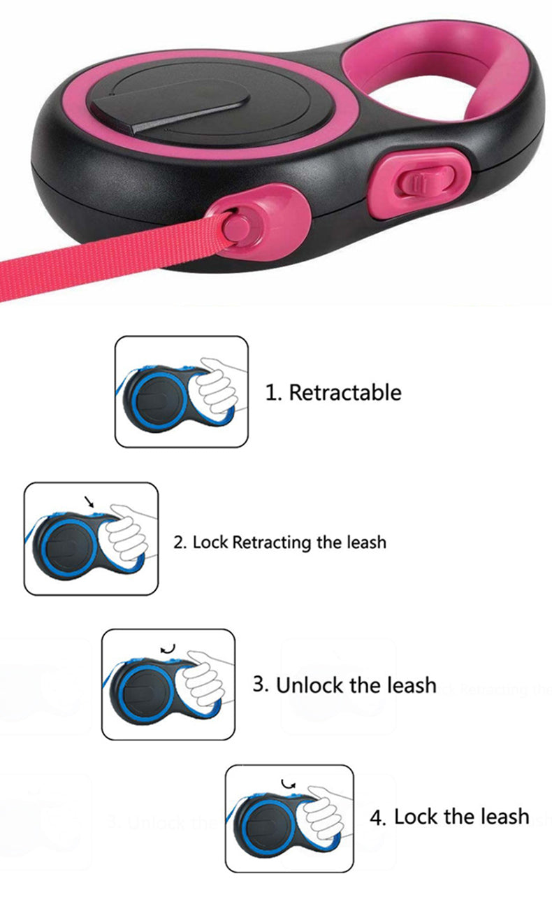 Our Retractable Pet Leash has a Secure Locking Mechanism that allows you to adapt the leash to whatever length you wish while the Retractable Durable Nylon Tape gives you plenty of space for you and your dog to enjoy a safe walk. Simply hold the Leash by the handle and the SMOOTH and DURABLE Retracting Mechanism will keep the leash tight. To stop the leash, press the brake button with your thumb. It will remain locked as long as the button is pressed. Our Reliable Lock System gives you full control, enabling instant retraction of your dog when needed.
