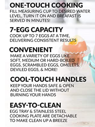 - One-touch cooking: simply fill the measuring cup to your desired water level, choose between soft, medium or hard boiled, turn it on and in a matter of minutes the alarm will let you know that breakfast is served