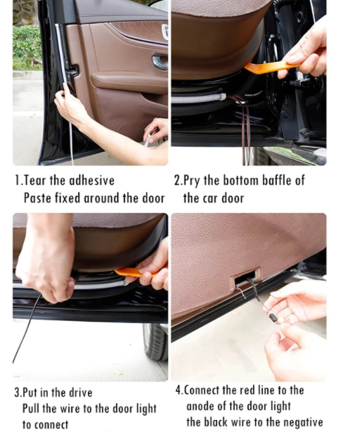 EASY INSTALLTION 1. Tear the adhesive around the edge of the door to fix it 2. Pry open the gap at the bottom of the door 3. Put in the drive to hide, pull the wire to the door light 4. The red line is connected to the anode of the door Black wire to negative
