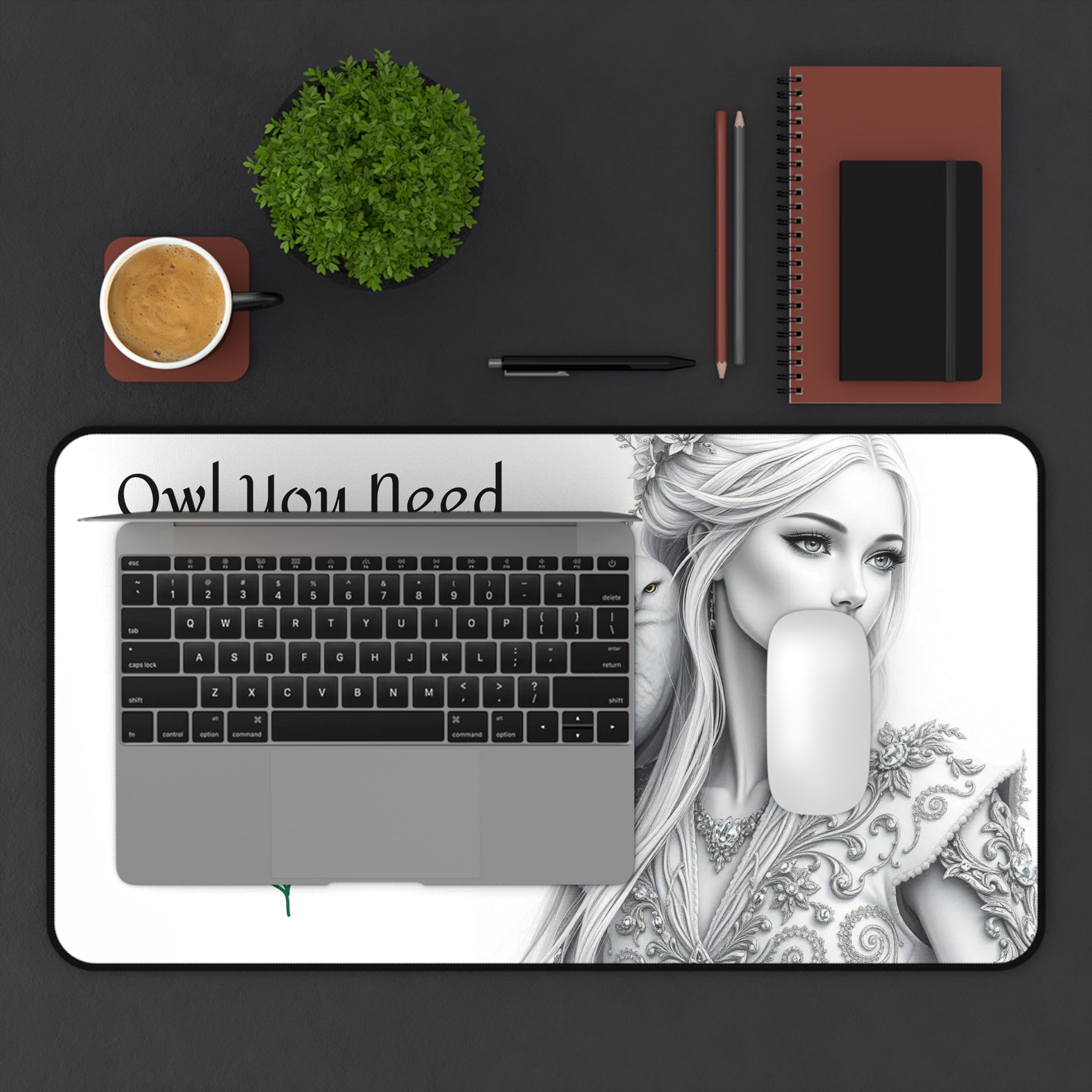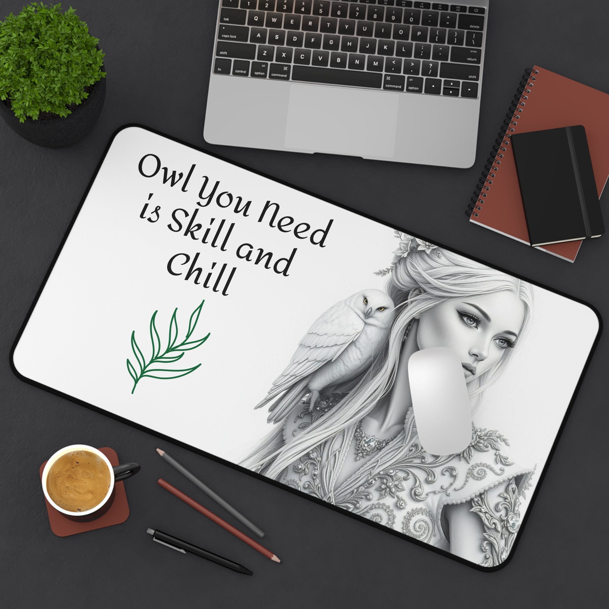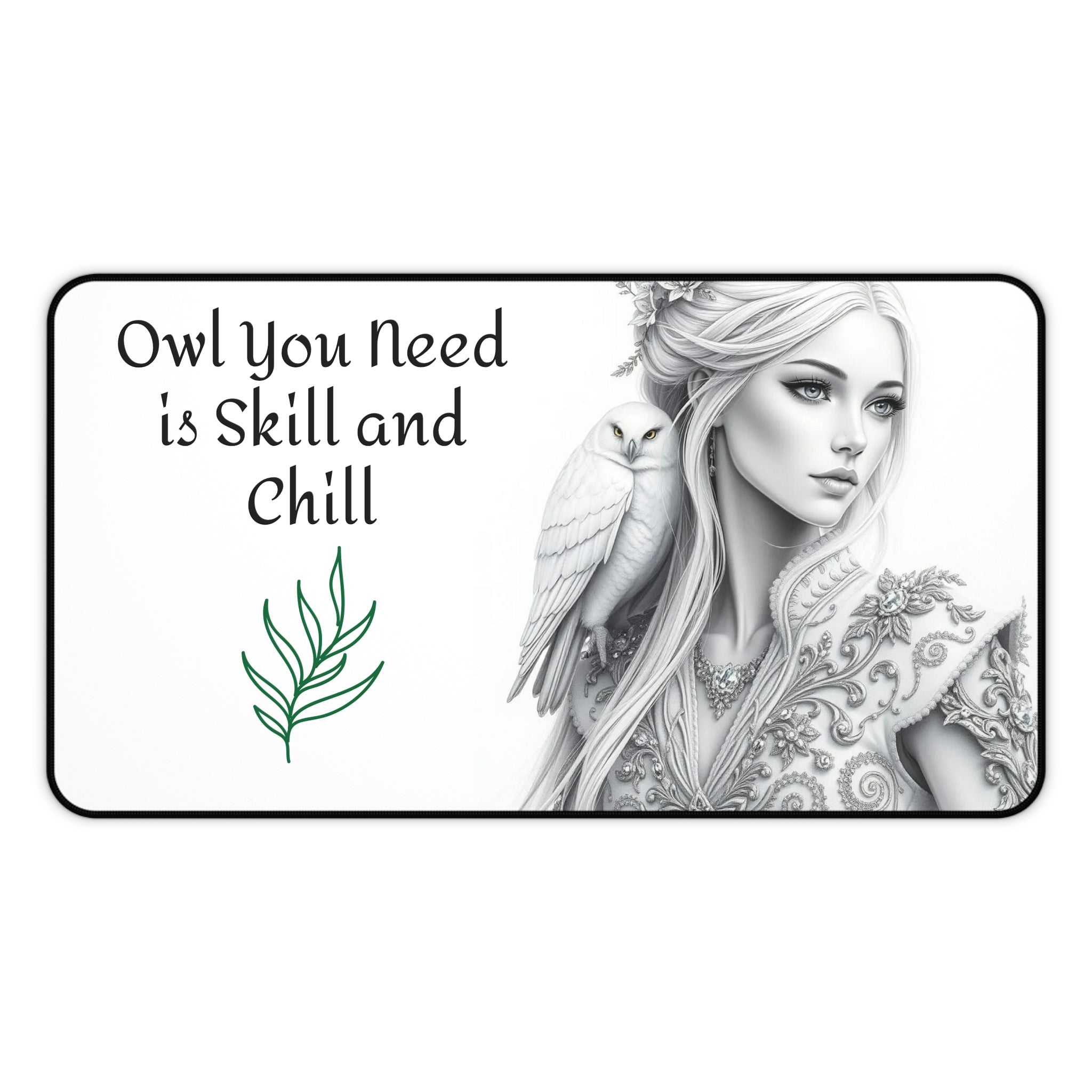 Motivational desk mat featuring black and white pencil drawings of a beautiful woman with an owl on her shoulder. Perfect for adding a touch of inspiration to your workspace and staying focused during work or study. Ideal for individuals looking to personalize their desk and create a productive atmosphere. Great for back-to-school season, graduation gifts, and office decor.