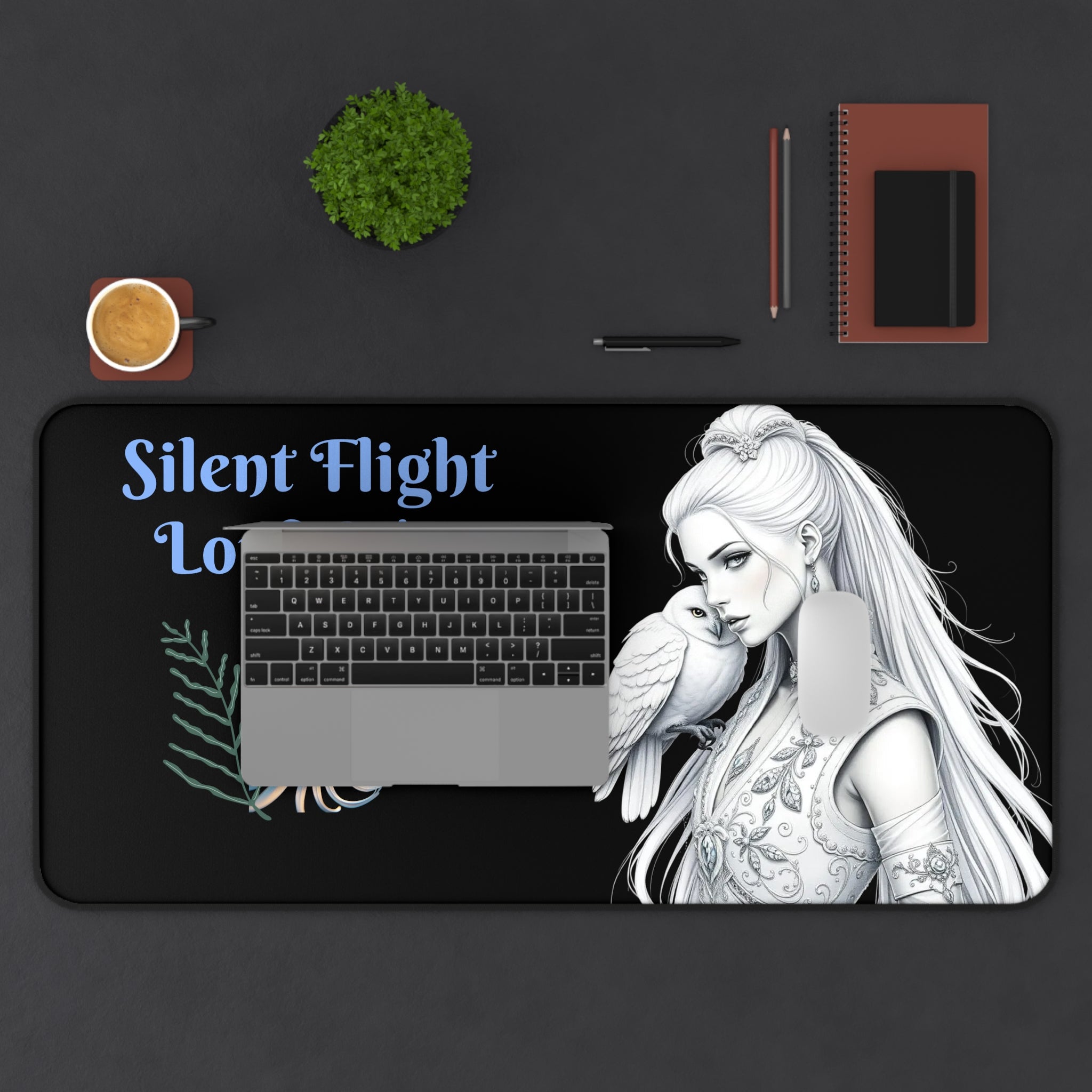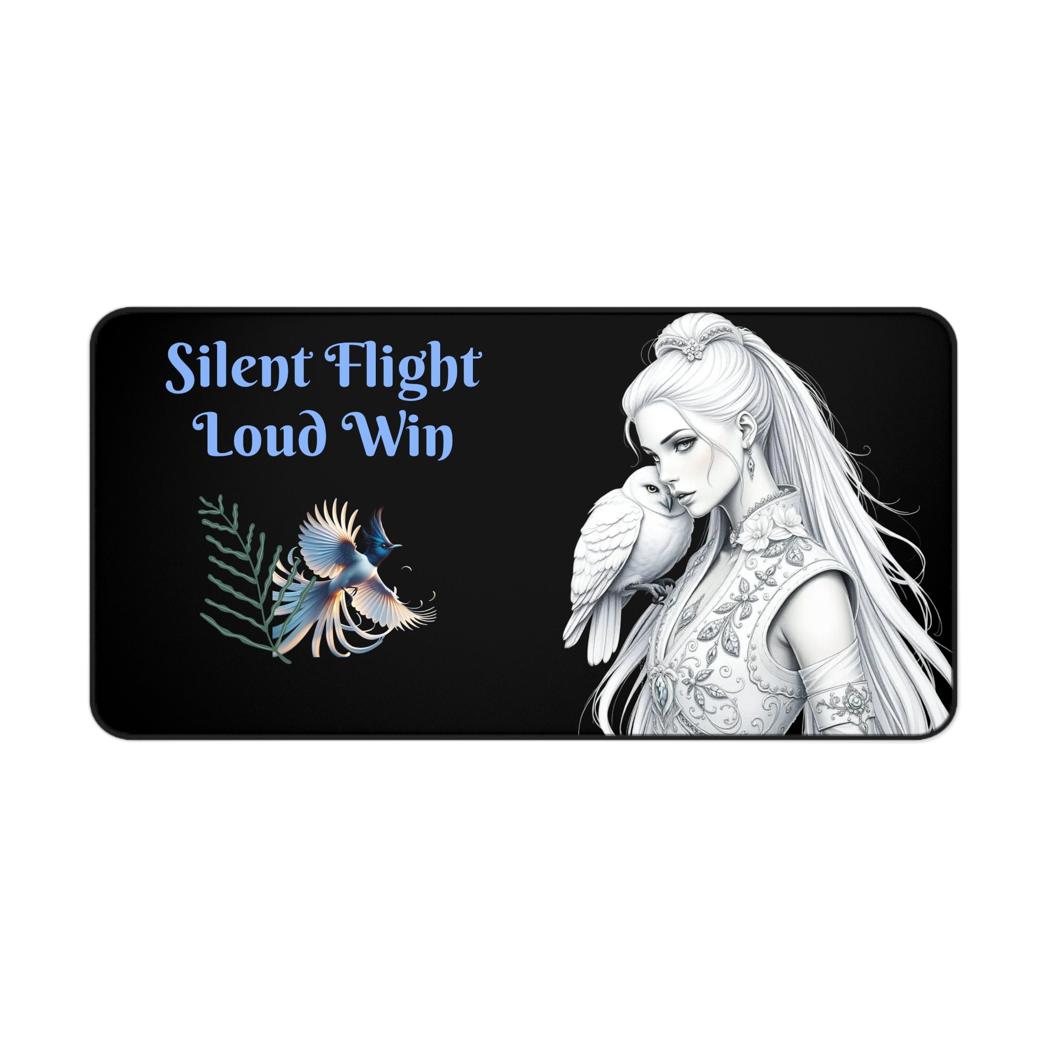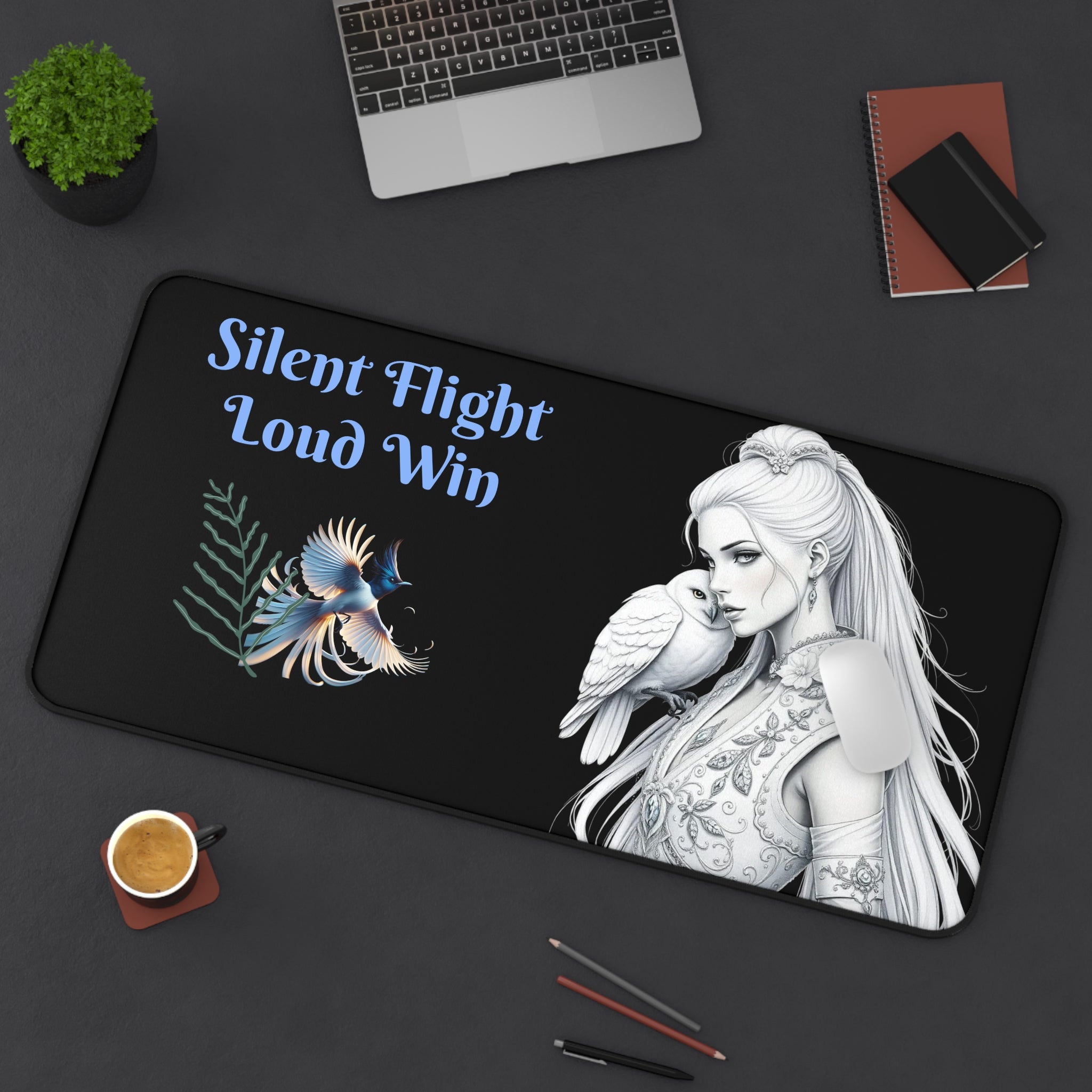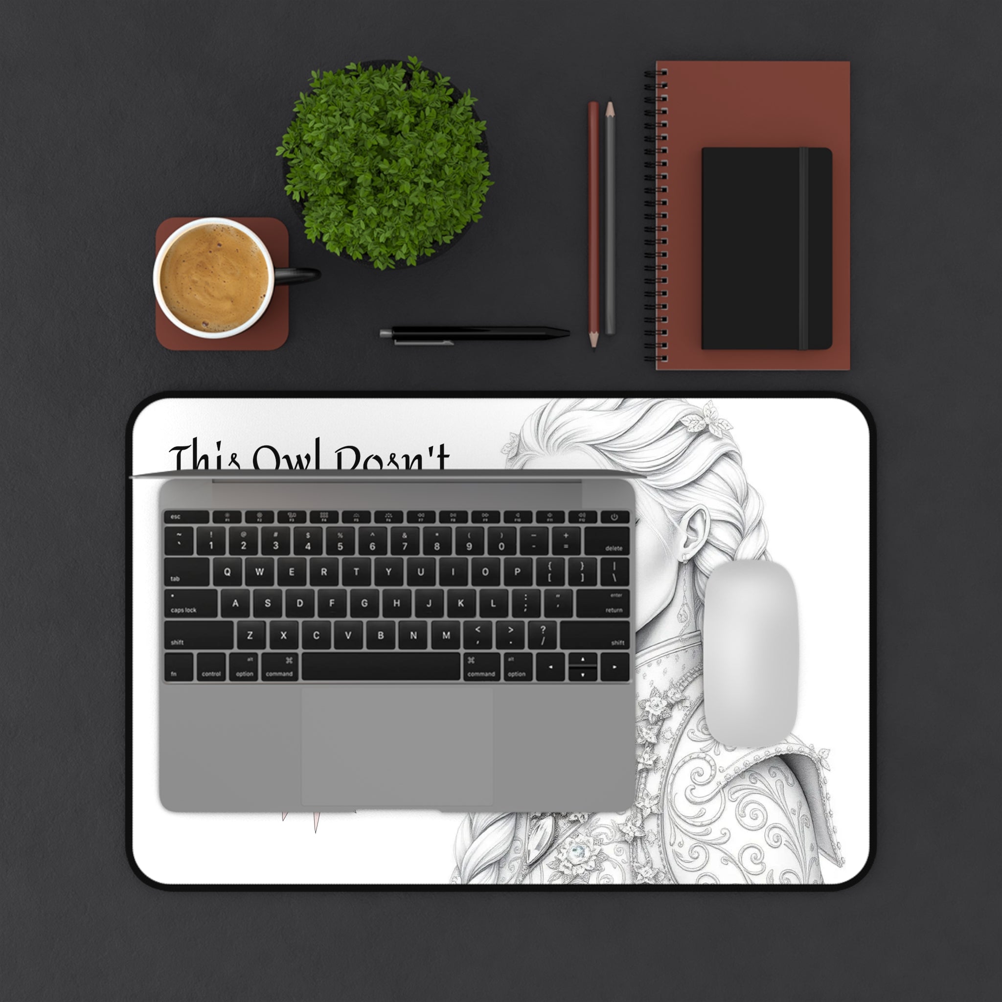 Motivational desk mat featuring black and white pencil drawings of a beautiful woman with an owl on her shoulder. Perfect for adding a touch of inspiration to your workspace and staying focused during work or study. Ideal for individuals looking to personalize their desk and create a productive atmosphere. Great for back-to-school season, graduation gifts, and office decor.