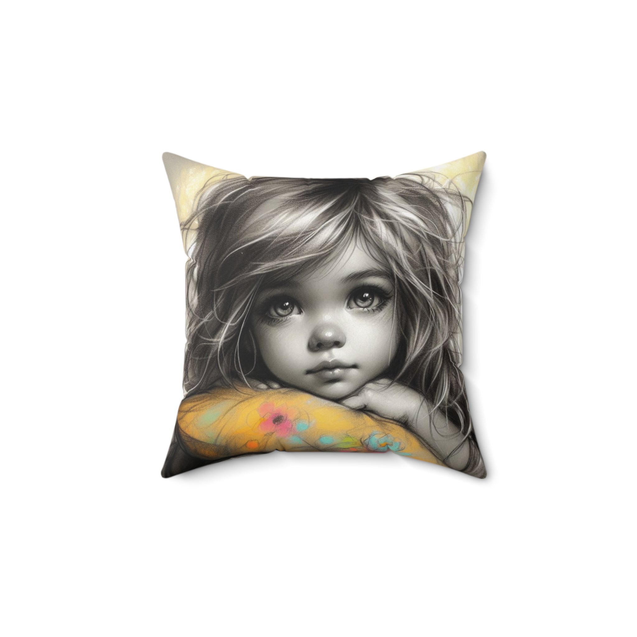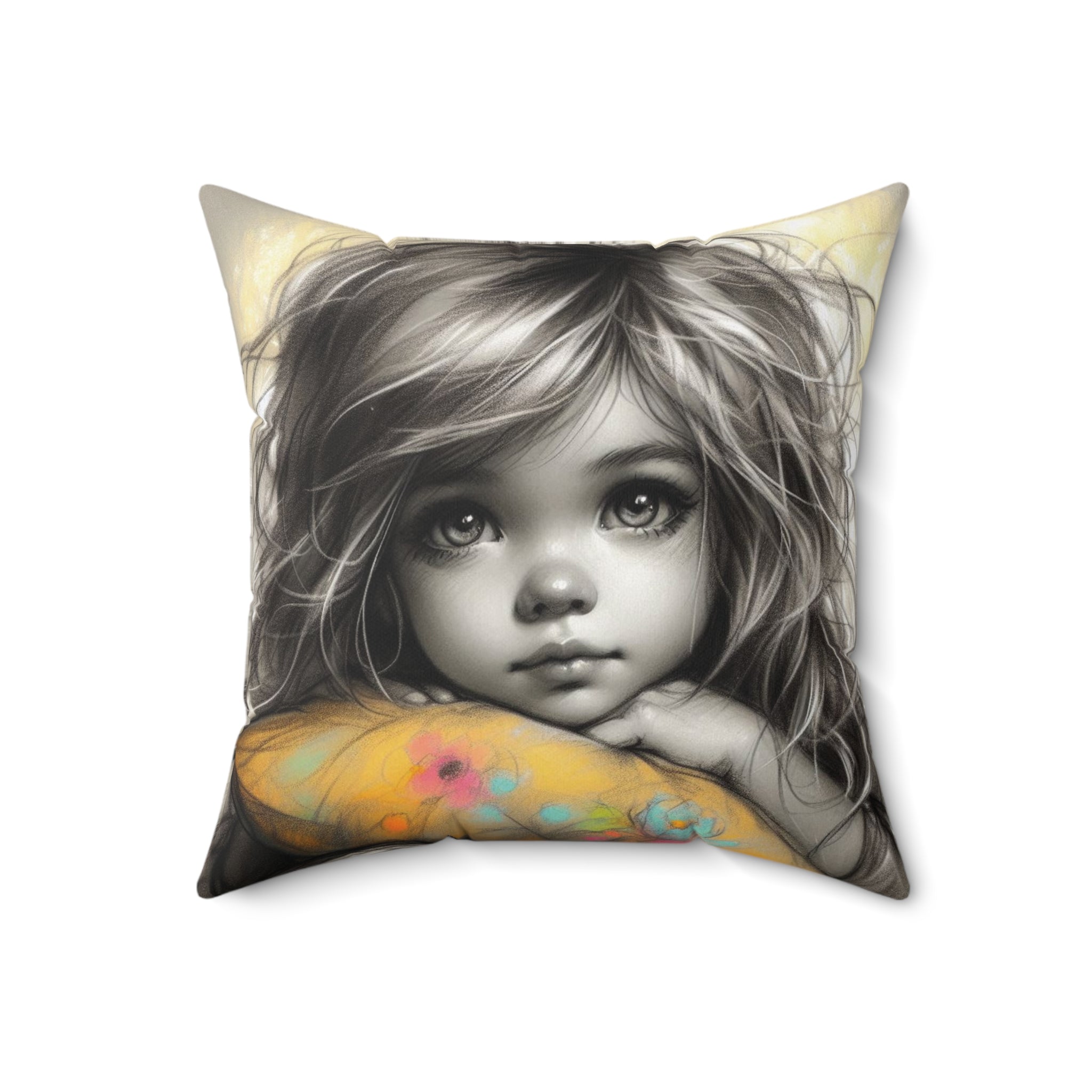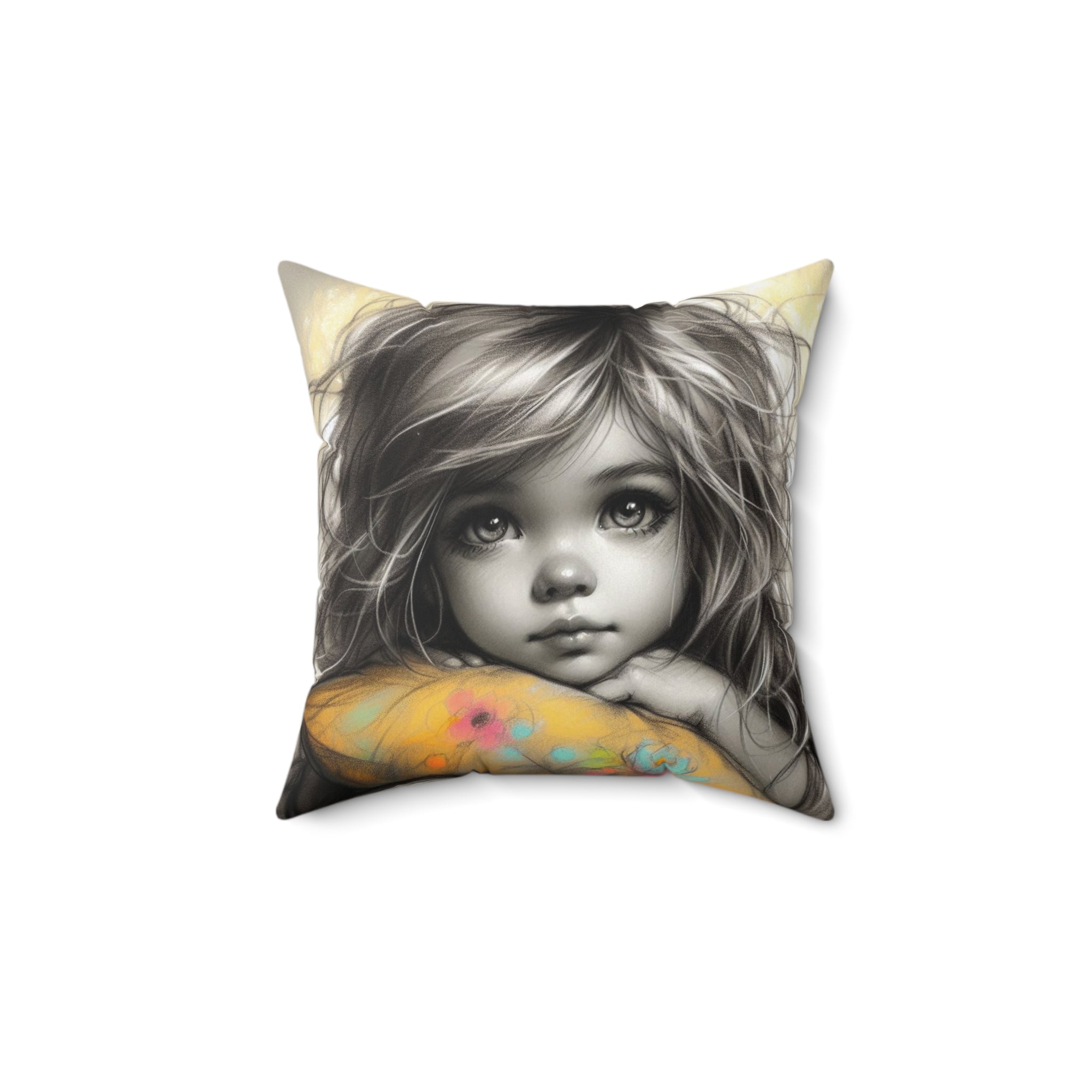 A square pillow designed for toddlers, featuring a double-sided print. Made from 100% spun polyester, this pillow is durable and retains its shape without wrinkling. The beige plastic zipper with a metal head adds a stylish touch, while the included recycled polyester insert provides extra volume. Perfect for adding a cozy and playful vibe to a toddler's room decor or as a gift for parents with young children.