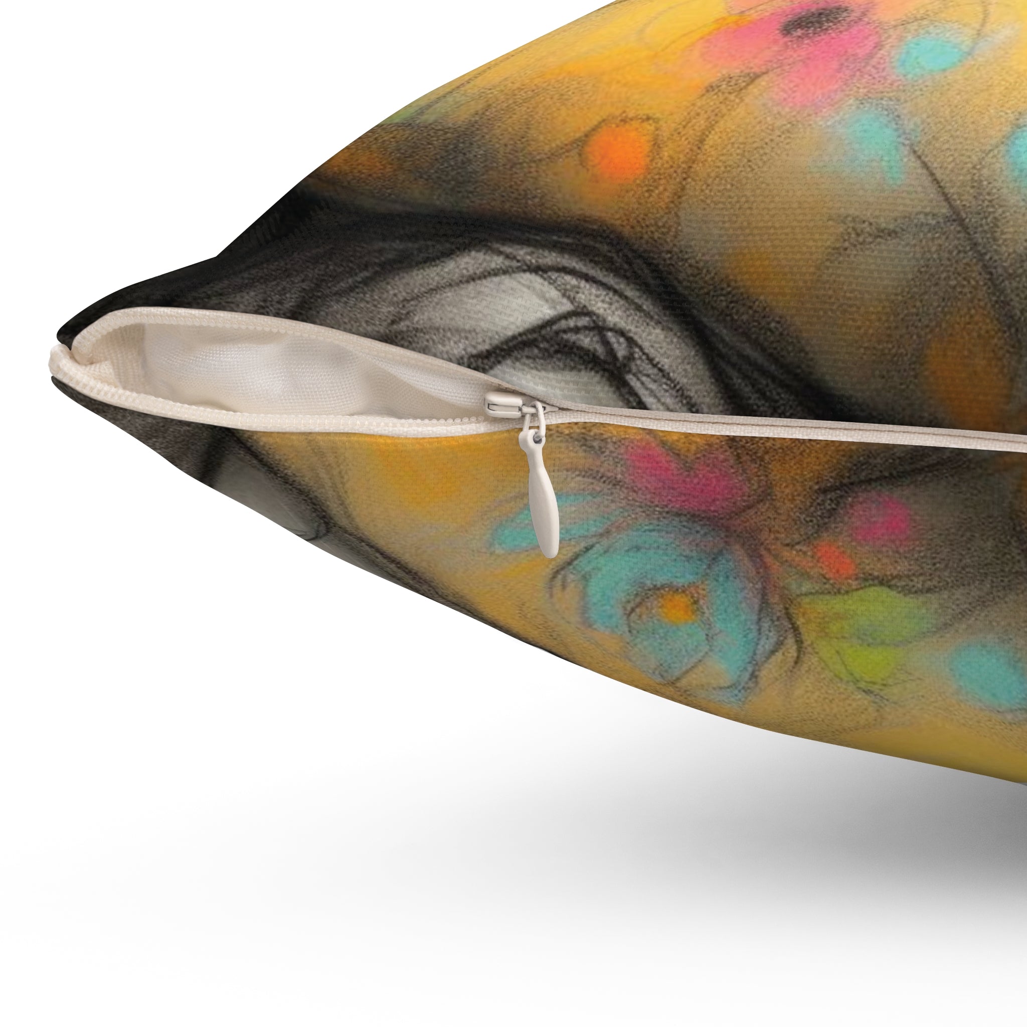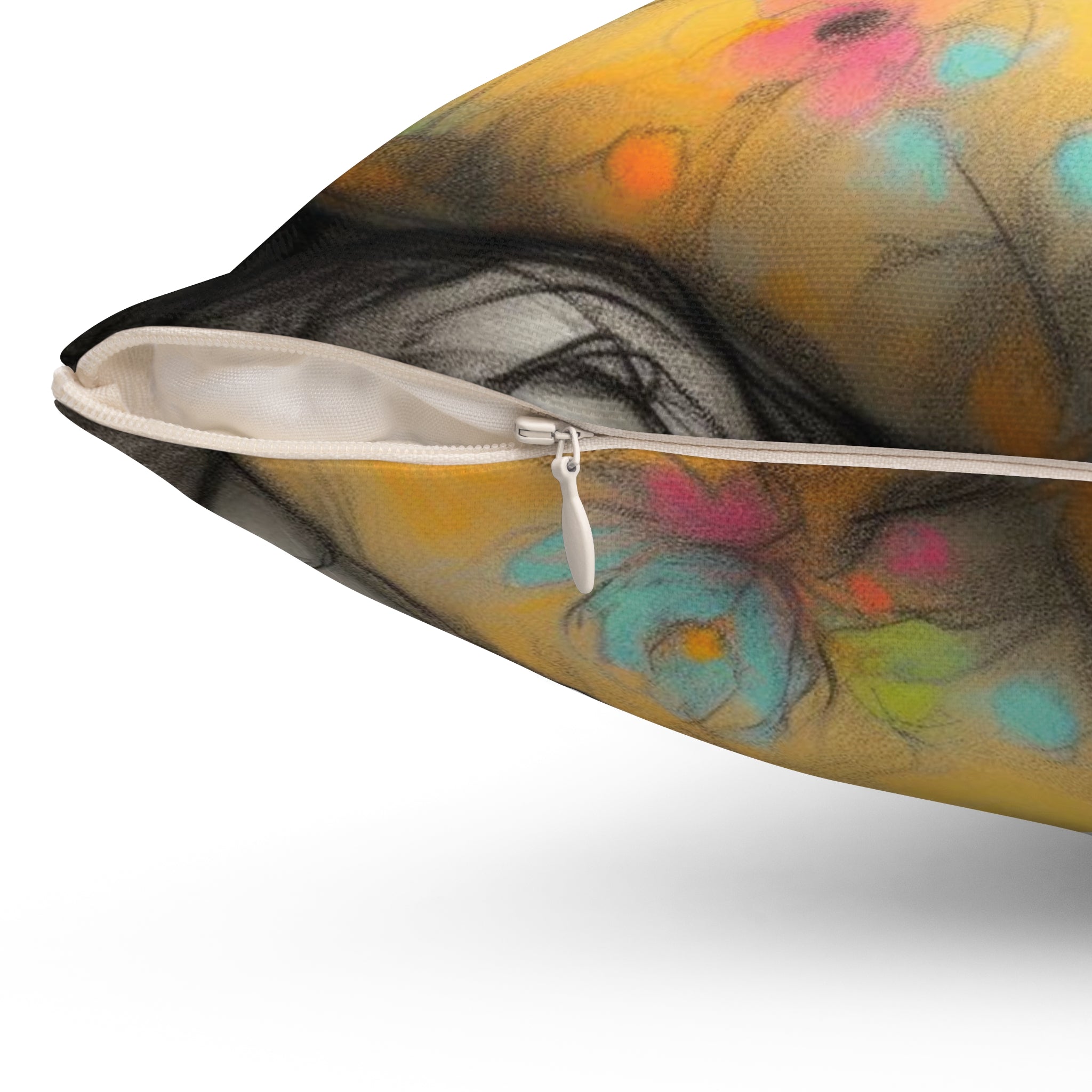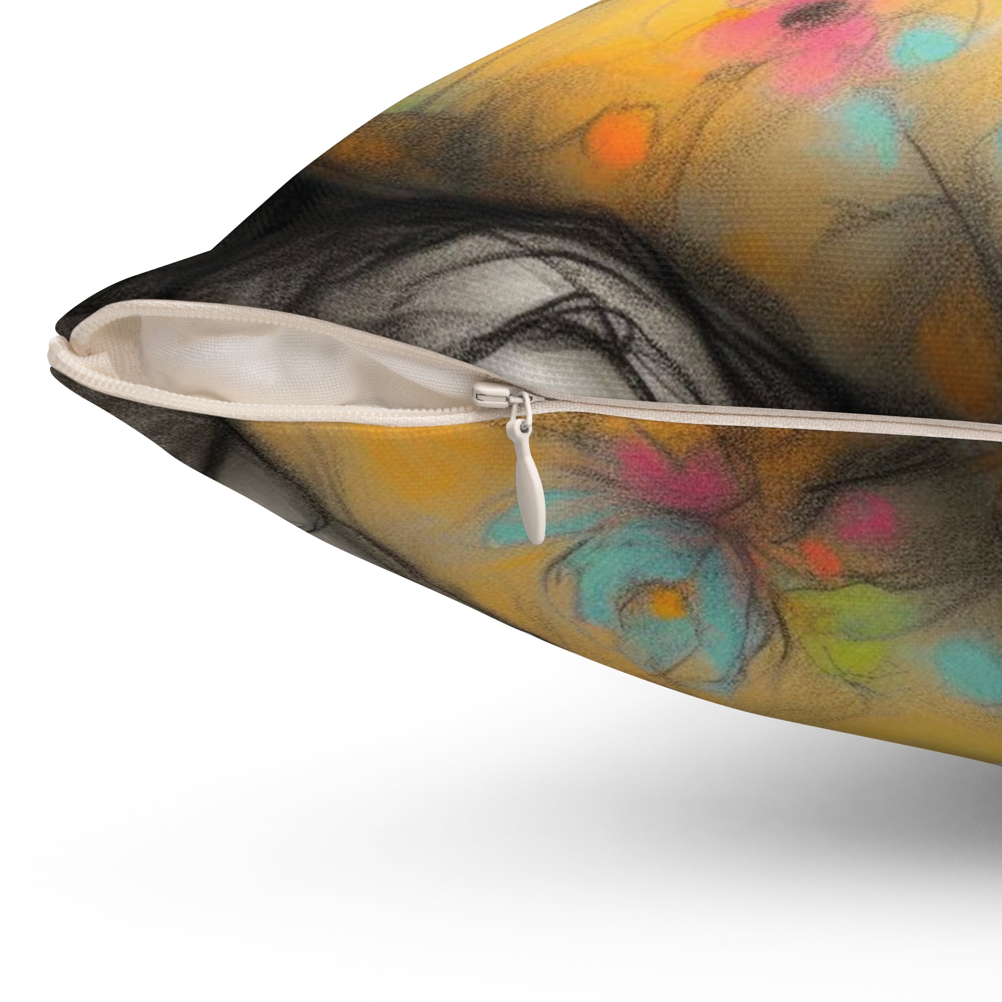 A square pillow designed for toddlers, featuring a double-sided print. Made from 100% spun polyester, this pillow is durable and retains its shape without wrinkling. The beige plastic zipper with a metal head adds a stylish touch, while the included recycled polyester insert provides extra volume. Perfect for adding a cozy and playful vibe to a toddler's room decor or as a gift for parents with young children.