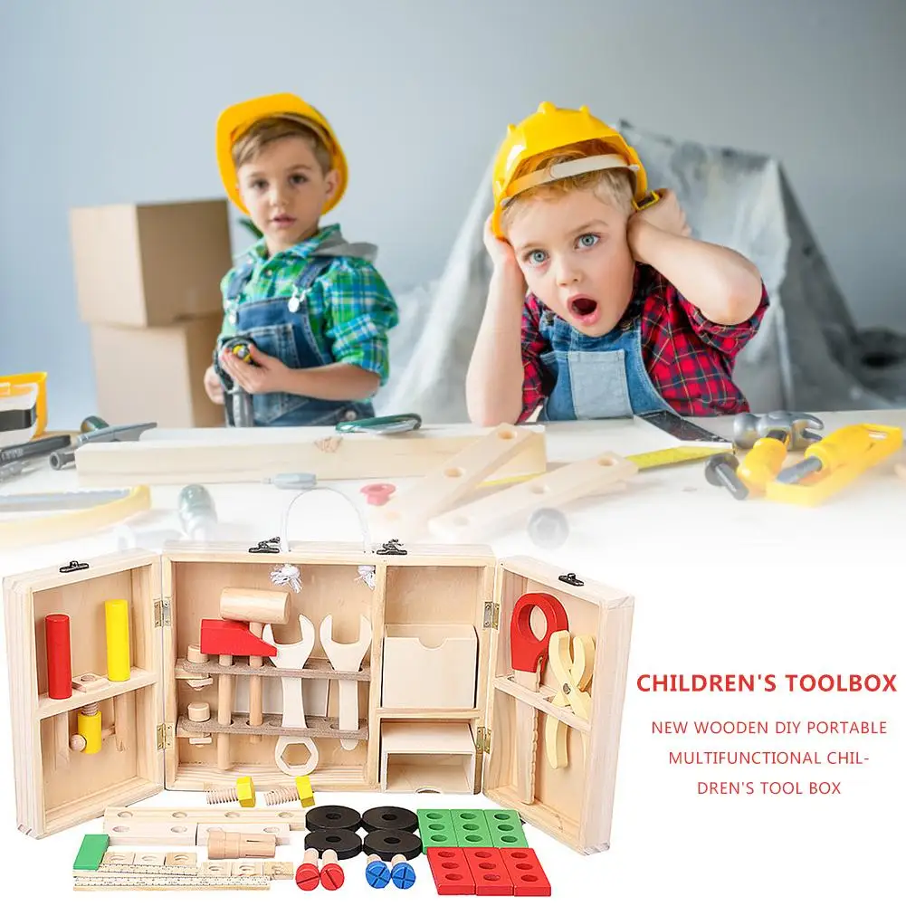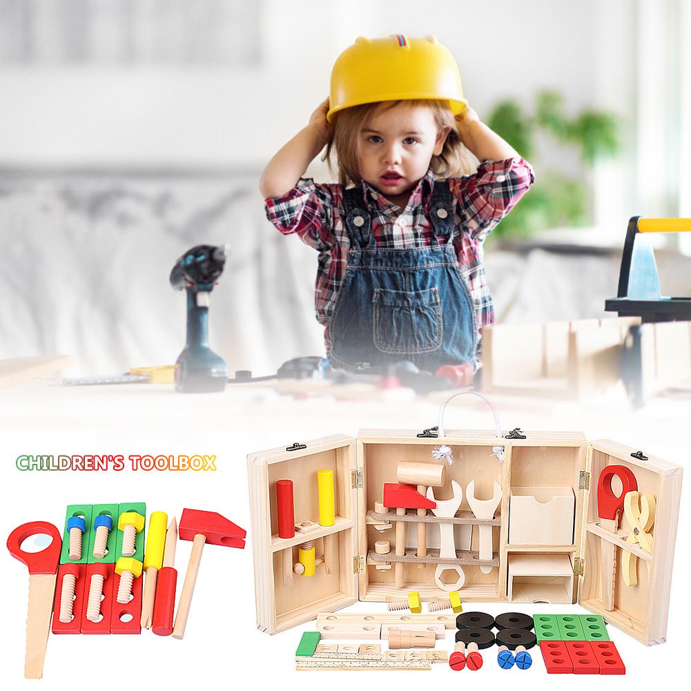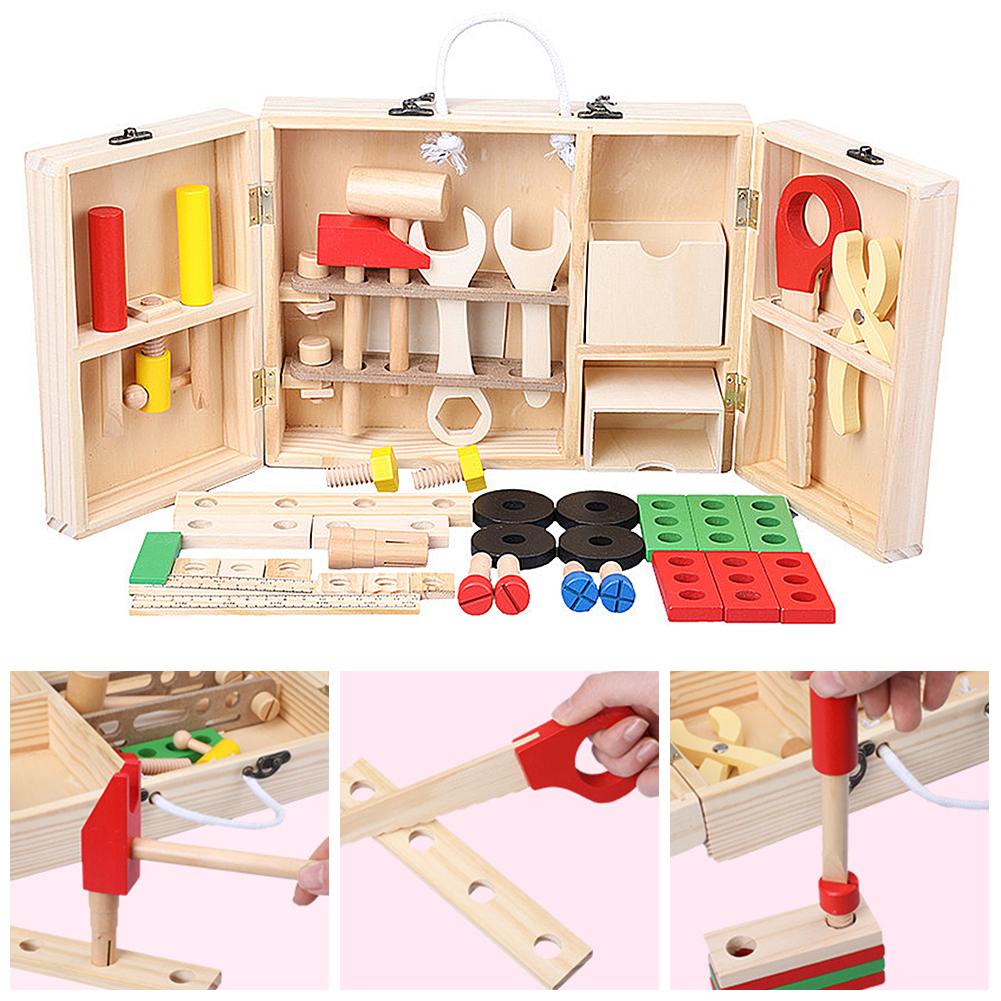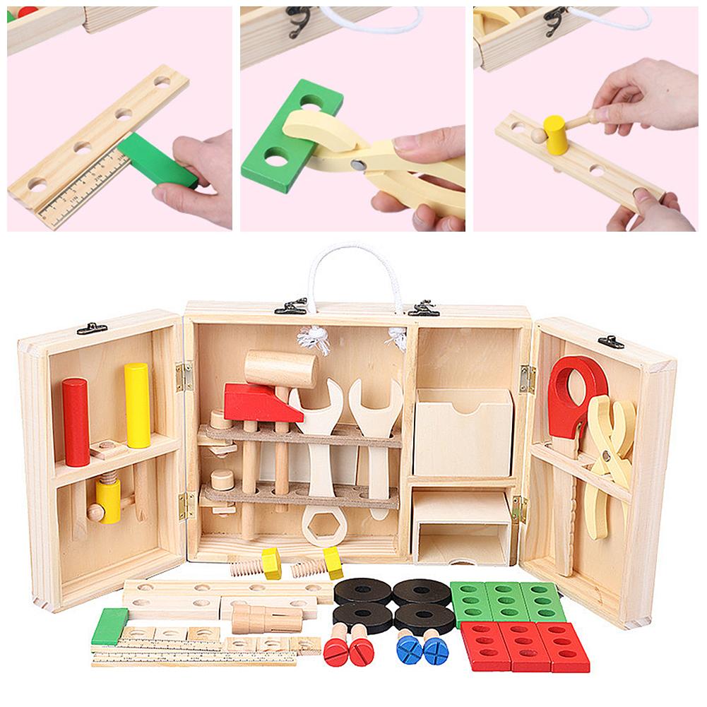 Package ncludes: The wooden toolbox set enables your kids to use their imagination, and the package includes the case, saw, ruler, Phillips screwdriver, straight screwdriver, mallet, claw hammer, wrench, nail, screw, pliers and various wooden accessories.