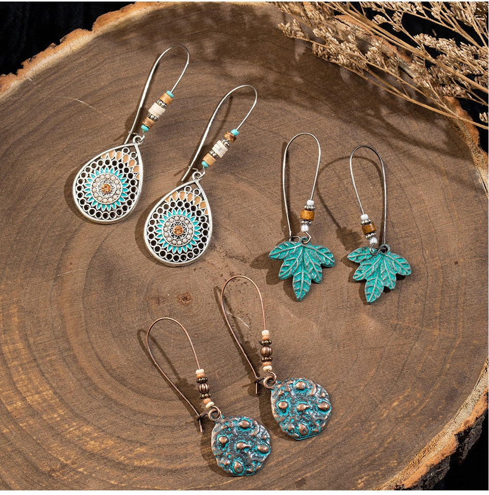 Bohemian Hook Earrings are super cute and very artsy. These long dangling wire ear threaders feature natural shapes, such as leaves, beads, turquoises, colorful water drops and round shapes. They also come with a hollow design and teal blue colors. The intricate details and unique patterns on each pair, really make them stand out.cc It is easy to match very outfits and make you the focus of attention.